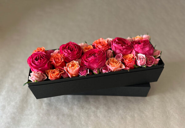 ピンクの大輪の薔薇をメインに、ピンクのスプレー薔薇等、数種類の薔薇ををあしらったローズボックス。